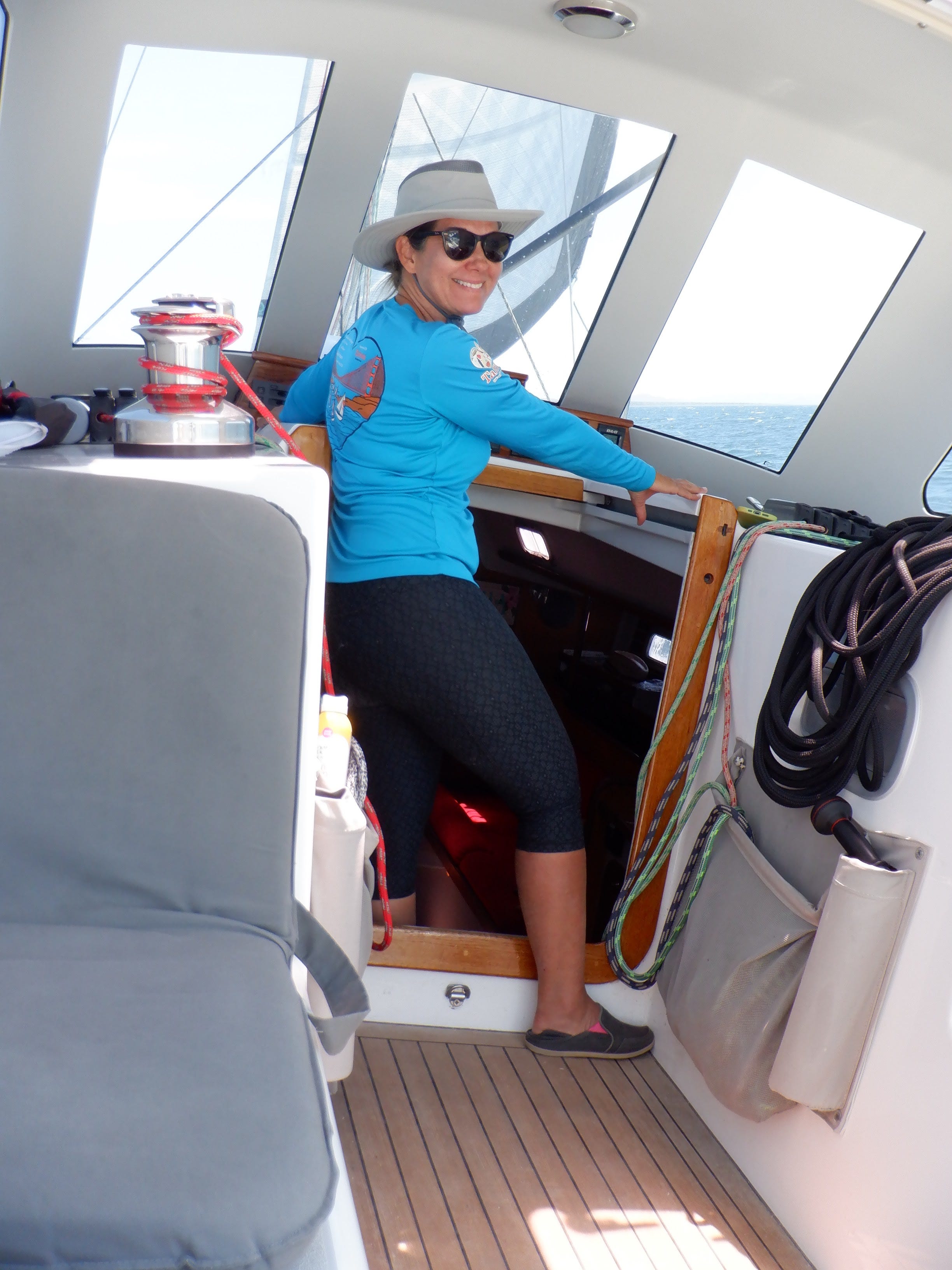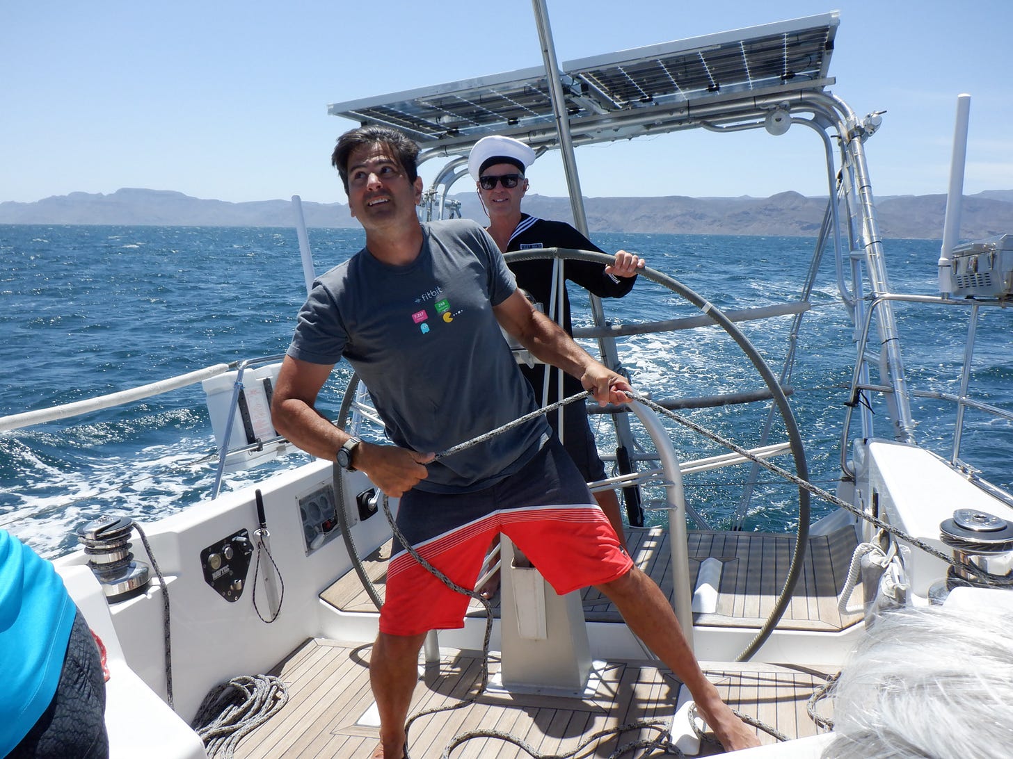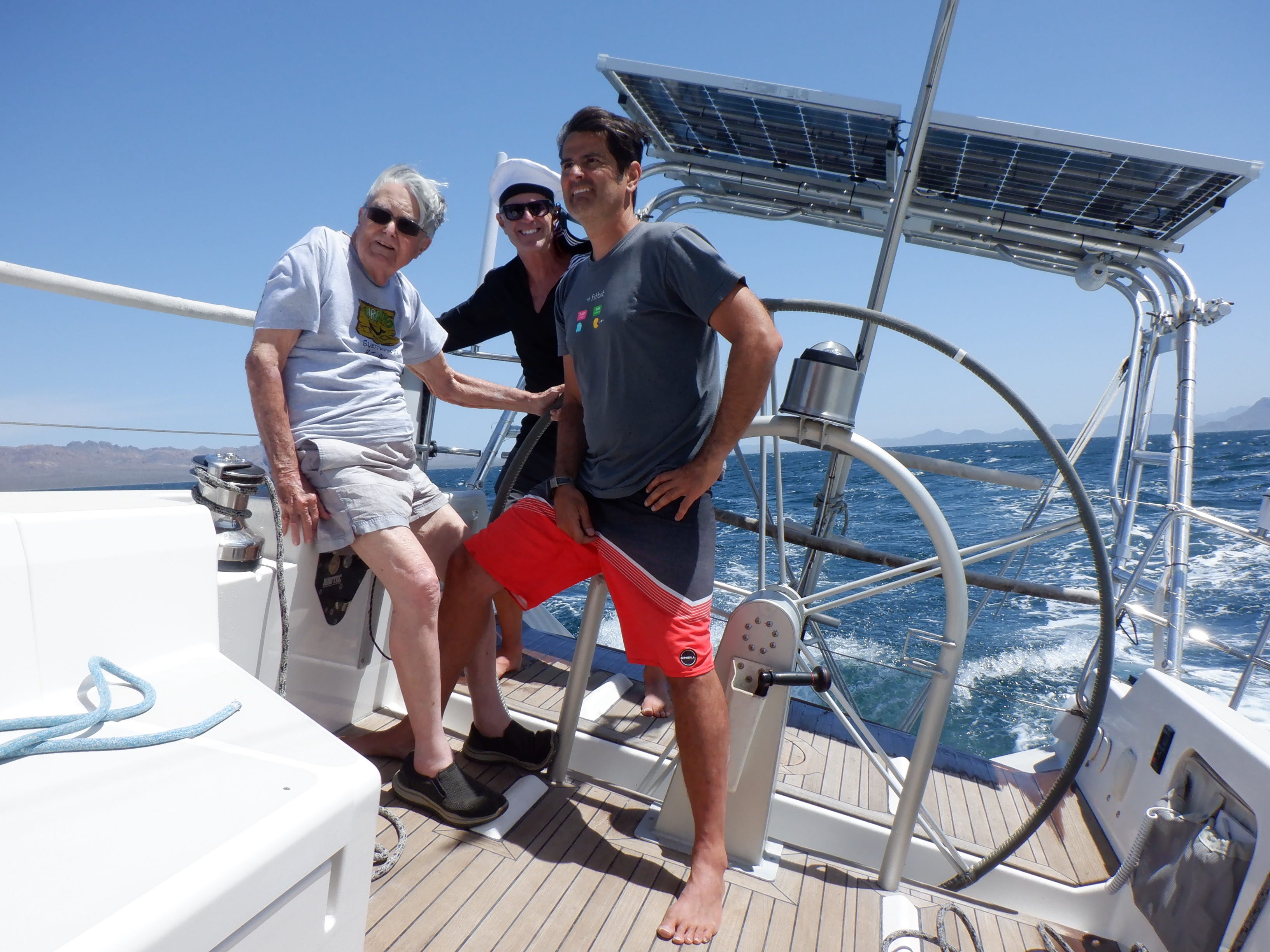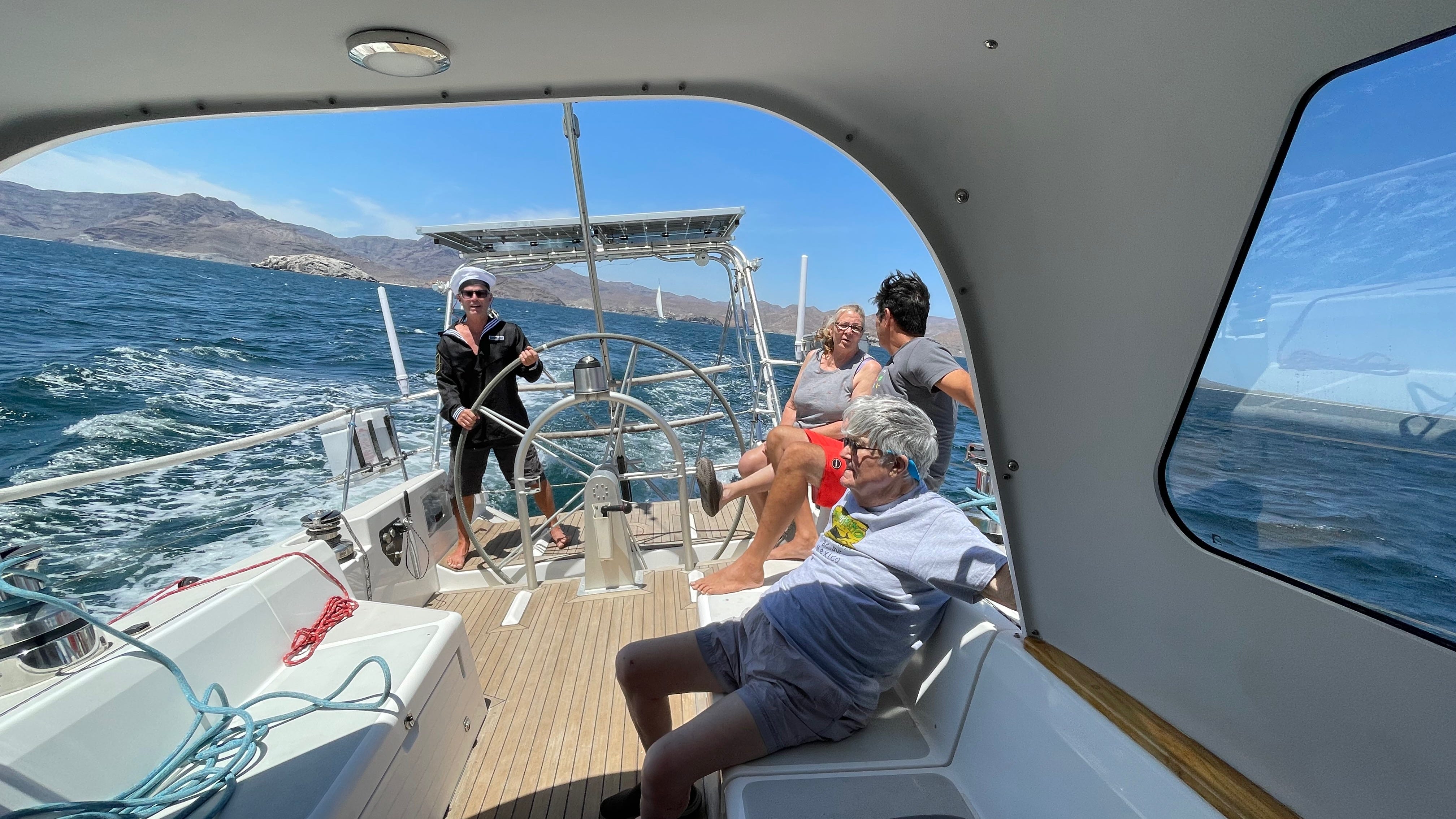 After a quick check-in with Leslie, Peter helped Charlie get across the tilted deck into a position where he could easily perch and steer the boat, as we sped towards the finish line. What a thrill it was to witness him holding the boat’s power in his hands with the wind in his hair. Charlie is sailing again on the Sea of Cortez!