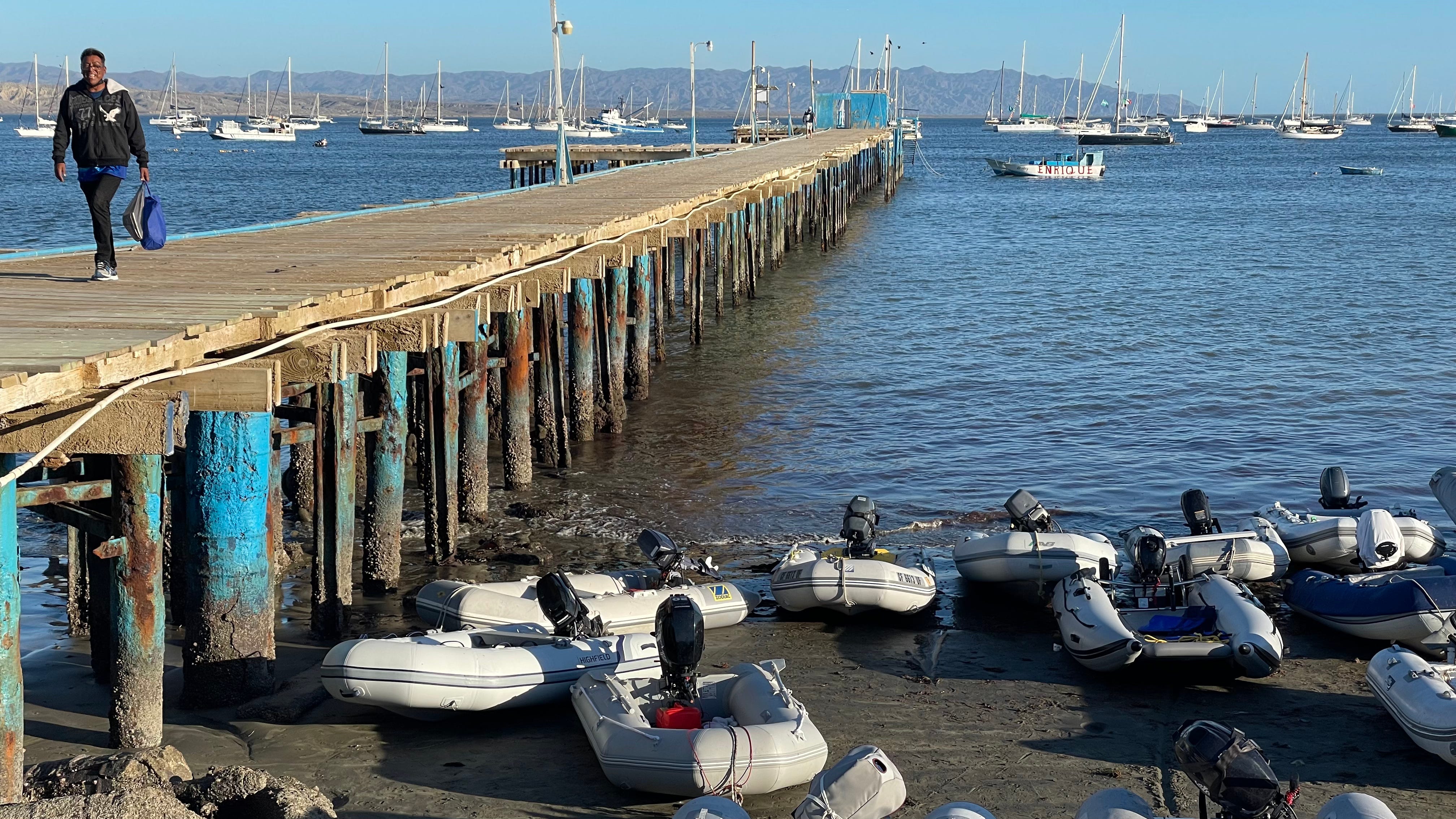 After our checkin, we were excited to explore the town and go to the baseball game. We tried for almost an hour to hail a panga. We waited and waited and we just couldn’t wait any longer to get on solid ground. We stored our dinghy in the lazarette for the passage and we really didn’t want to have to get it out as we would need to put her back before our next passage to Bahia Santa Maria. We finally pulled it out and brought it up on deck. We each took turns pumping the air into it. Once the dinghy was full, we attached the spinnaker halyard to hoist her over the lifelines and into the water. Then we used the main halyard to hoist the outboard out of the lazarette (access to our storage) so we could attach it onto the dinghy.
